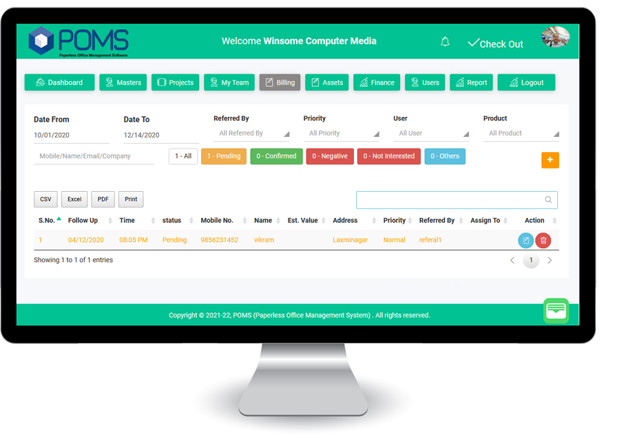 Online Paperless Office Management with centralize database and accessing from anywhere, anytime. The core feature of this software is Customer, Employee, Task, Attendance, Leave, Expense, Salary, Billing, Approval & access control of data with right person any time.